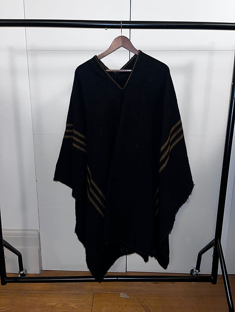 Black wool poncho with ochre embroidered detail